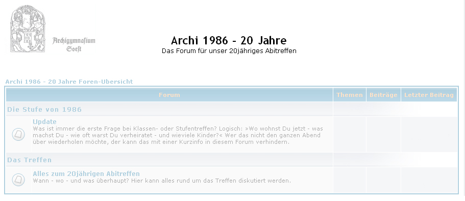 Bitte registriert Euch auf der nächsten Seite; erst dann könnt Ihr im Forum lesen und Beiträge verfassen oder beantworten. Wir benötigen nicht mehr als Euren Namen und eine E-Mail-Adresse, aber nur so so können wir alle Ehemaligen gleichzeitig mit Informationen über das Treffen versorgen und gleichzeitig gewährleisten, dass die Daten von uns allen nicht in falsche Hände geraten. Bitte benutzt bei der Registrierung Euren ganz normalen Namen (in der Form Vorname Nachname), damit wir die Mitgliederliste des Forums mit der Liste von 1986 abgleichen können. |